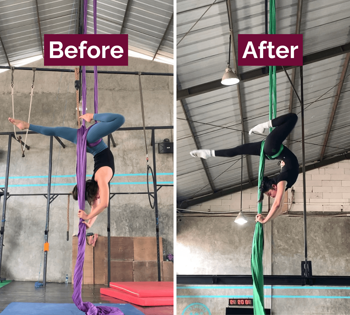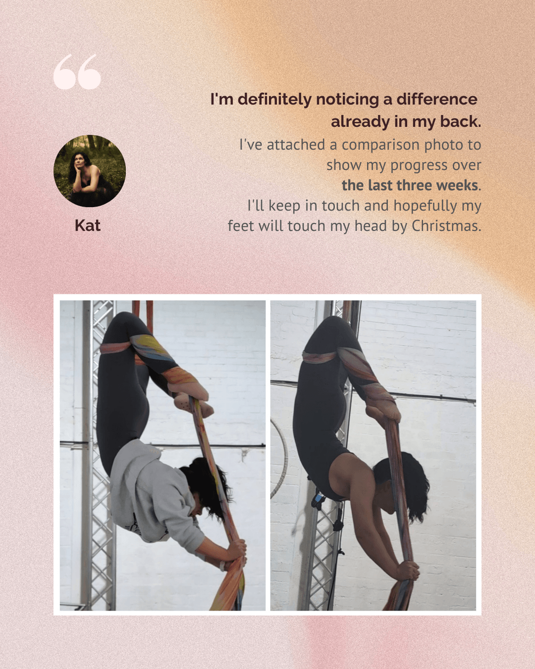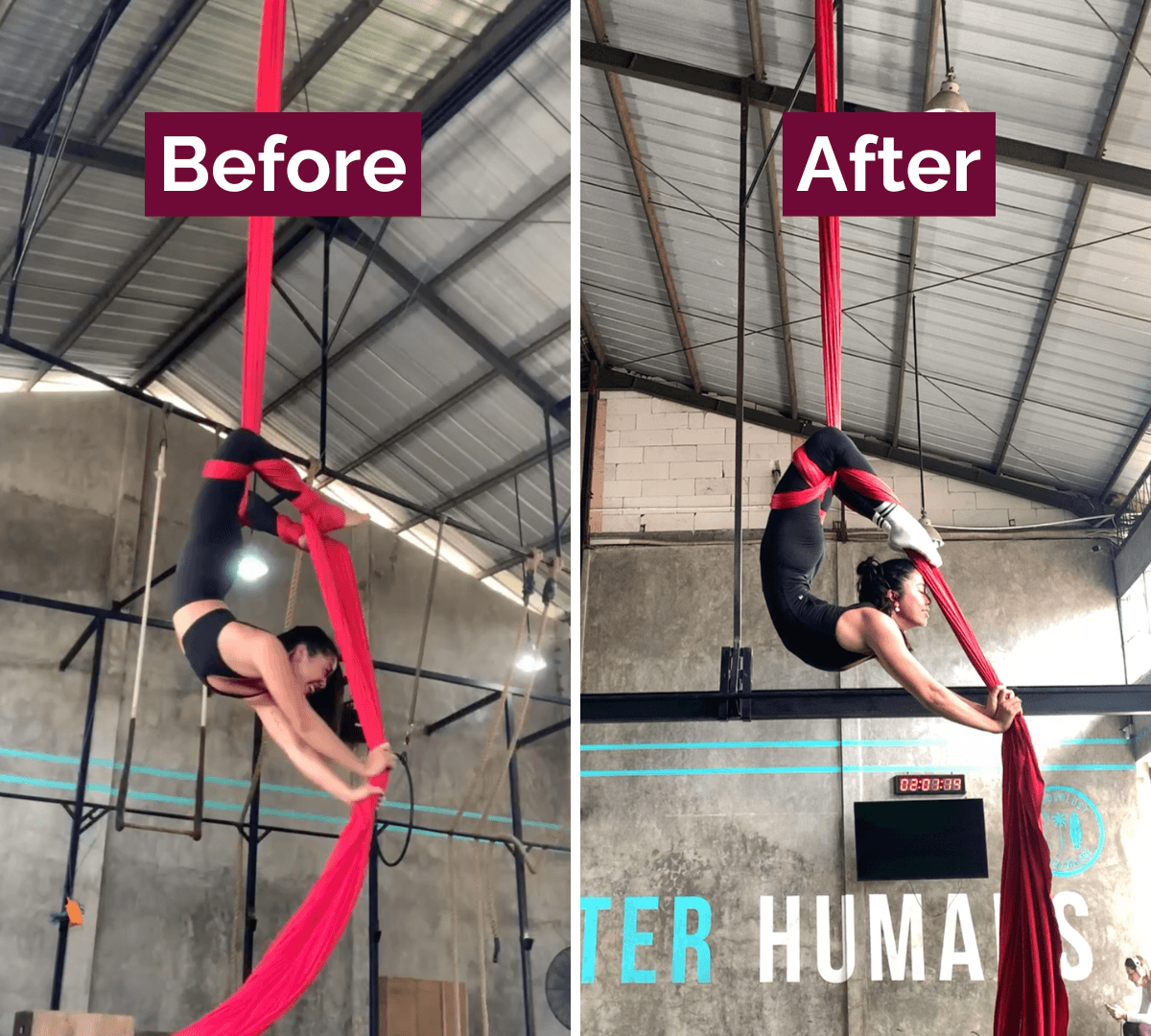 Over a short time, my backbends became better and I finally overcame my plateau! I hit poses I never thought were possible for me. My back felt stronger and more open, and the stiffness and aches I used to feel after training were gone. My aerial trainings became smoother, more confident, and more fun.